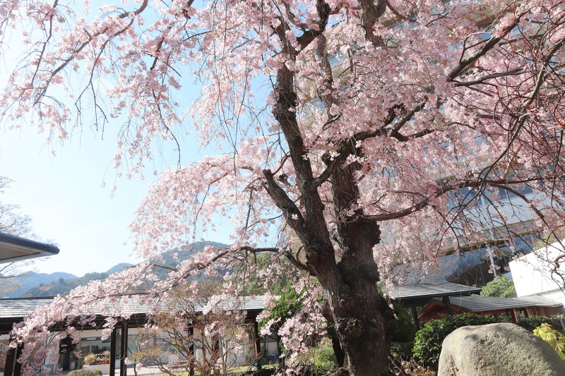 向陽閣の庭園にある八重紅枝垂桜が、見頃を迎えています。下から見上げると、青空を背景に広がる淡い紅色の花がひときわ鮮やかに映ります。