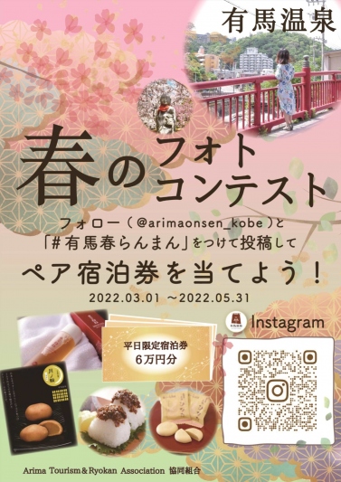2022.03.01 お知らせ 『有馬温泉 春のフォトコンテスト』開催中 有馬温泉のインスタグラム(arimaonsen_kobe)にて春のフォトコンテストを開催しております。 ★今回のテーマは「#有馬春らんまん」です。 最優秀賞に選ばれた方には、豪華景品をご用意しております。詳細条件は arimaonsen_kobe をご覧の上、ご応募くださいませ。 Premium lounge "Miya Terrace" プレミアムラウンジ『みやてらす』オープンのお知らせ 記事一覧に戻る