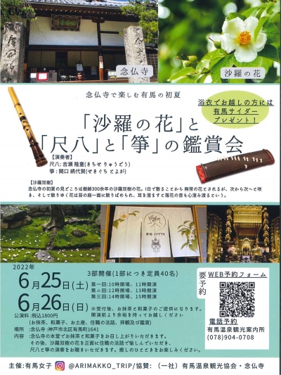 ■内容 : 念仏寺の本堂でお抹茶と和菓子をお召し上がりいただきます。その後、沙羅双樹の花を正面に住職の法話を楽しんでいただき、尺八と箏の演奏をお聴きいただきます。癒しのひとときをお楽しみ下さい。浴衣でお越しの方には有馬サイダーをプレゼント!当館ご宿泊でイベントへお出掛けの際は是非浴衣でお越し下さいませ。