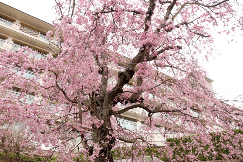 2024.04.09 兵衛彩時記 兵衛のさくら便り2024 5通目 9階庭園の八重紅枝垂桜が満開になりました。 本日は生憎の曇り空で肌寒い日ですが、満開の桜が気分を明るくしてくれます。 湯上り処からも見られますが、庭園渡り廊下から見上げると紅色が視界一杯に広がります。 少し葉が出てきている枝もあり、見頃はあと数日となりそうです。 ゴールデンウィーク 館内イベントのお知らせ 「第15回 みんなで選ぶ温泉大賞」西の前頭に入賞いたしました 記事一覧に戻る