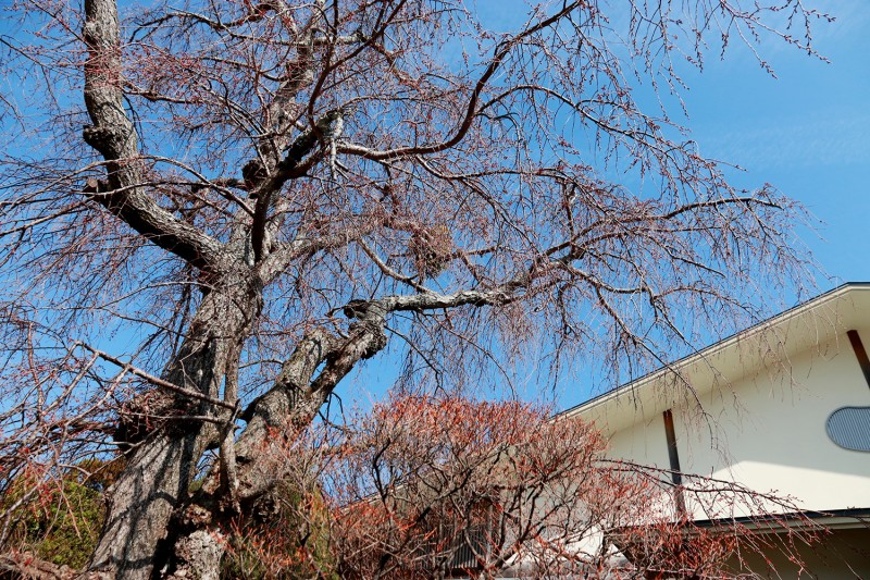 樹齢100年を超える当館自慢の桜で、満開はもちろん、花びらが散りゆく姿もまた美しく、ぜひご覧いただきたい一樹です。