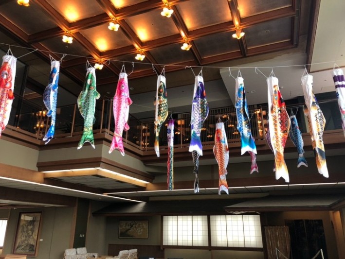 湯上り処の吹き抜けを横断するこいのぼりをバックに、是非皆さまで思い出の一枚を残してください。