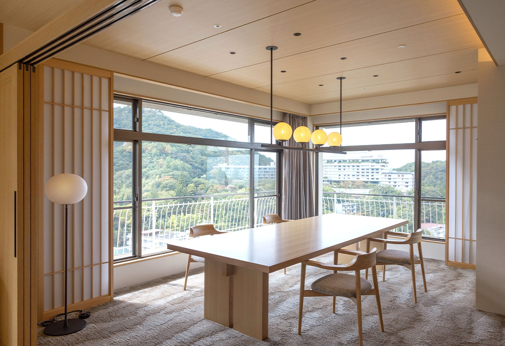 有馬の美しい自然をイメージした華やかなテキスタイルやアートが散りばめられた空間で、ゆったりとお過ごしいただけます。絶景が楽しめるビューバスや、お食事や寛ぎの場としてご利用いただける専用ダイニングルームもございます。マッサージチェアとコーヒーセット(コーヒー・紅茶・ココア)をご用意しています。
